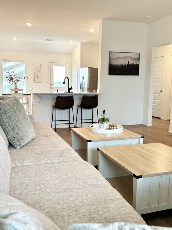 Inside, you’ll find a spacious open-concept living and dining area, a fully stocked kitchen with modern appliances, and smart TVs in every bedroom and the living room. A washer and dryer are available on-site, making this home especially comfortable for longer stays.