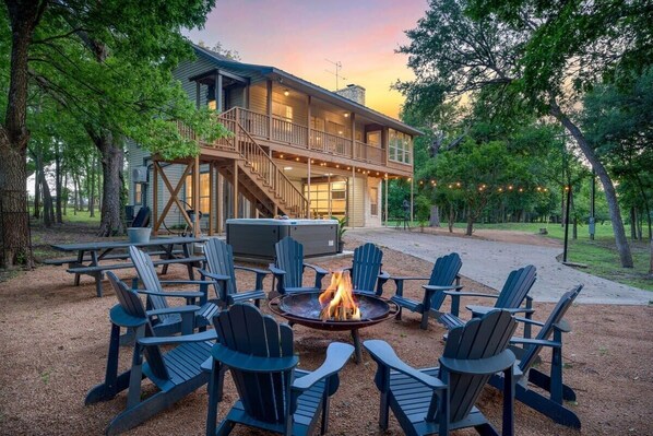 The impressive outdoor space features a picnic table, cornhole game, outdoor heater, grill, and a 42-inch fire ring surrounded by comfortable Adirondack chairs, perfect for enjoying the breathtaking views of the river and the surrounding nature.