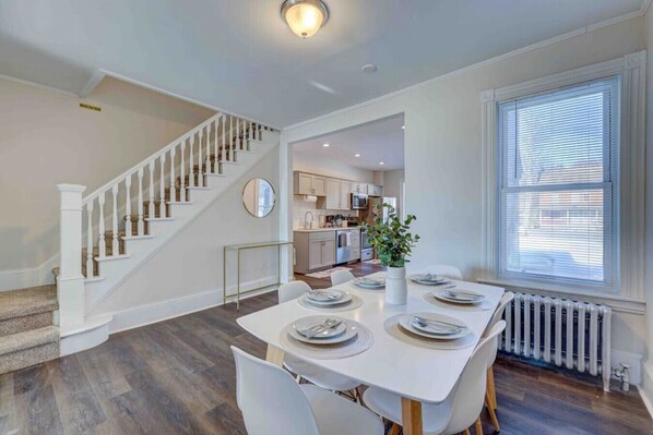 The townhome features a fully equipped kitchen in which you can easily prepare your favorite, delicious meals. Its space and modern amenities are everything you need to cook amazing meals with the ones you love. Feel free to help yourself with everything there is in the kitchen.