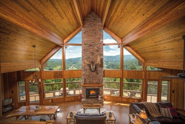 Nyt utsikten i hele hjemmet med familie og venner. Hjemmet tilbyr et åpent levende konsept perfekt for familiesammenkomster. Inni i hytta vil du føle deg helt rolig, nøye rene, moderne, men rustikke møbler og dekor. Håndlaget møbler av lokal fjellhåndverker. Bruk tid på å spille foosball, shuffleboard, maishull, jumbo jenga, jumbo connect fire og brettspill. Slapp av og les en god bok av peisen. Nyt gratis s'mores ved branngropen, varm opp i 6-personers luksuriøse boblebad, og avvikle med 180 graders utsikt over Blue Ridge Mountains. Vi kan garantere at du ikke vil forlate.