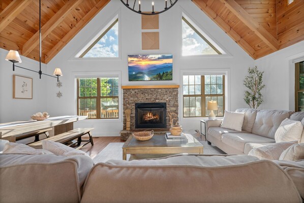 Step into the newly refreshed living room where white walls and vaulted wooden ceilings with exposed beams create a bright, inviting space. Gather around the gas fireplace or enjoy a movie night on the brand-new 65” Smart TV. All TVs in the home are Smart TVs, with one equipped with Roku. New Pottery Barn light fixtures set the perfect mood, while a playful neon wall reminds you to “soak it all in”—an IG-worthy feature guests love to capture.