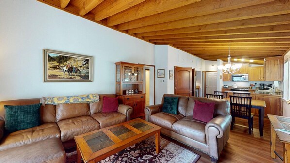 Denne leiligheten med 2 soverom / 2 bad i Elkhorn tilbyr ca. 1000 kvadratmeter boareal og soveplass til 4. Det åpne kjøkkenet har benkeplater i granitt og alle apparater i rustfritt stål og tregulv. Spisebordet har plass til 6. Stuen har en peis og 55-tommers flatskjerm-TV. Utenfor stuen er det et dekk med uteservering for å nyte utsikten om sommeren og høsten.