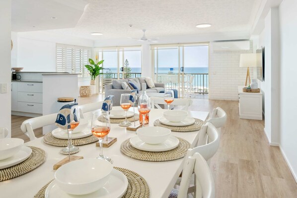 Characterised by a coastal charm, the apartment boasts convenience and comfort with its light and bright layout, three comfortable bedrooms, and its generous balcony and outdoor entertaining area. As you enter the apartment, the first thing you will notice is the beautiful ocean views that provide the ultimate backdrop for the kitchen and living space. The open-plan kitchen is fully equipped and stocked full of utensils and appliances.