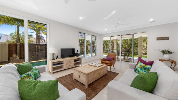 Easy and relaxed tiled living spaces merge together the indoor and outdoor living spaces. With the spacious layout, there is ample opportunity for families to hang out together or enjoy some quiet time apart.