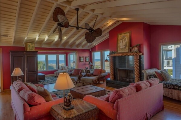 The beautifully landscaped and gracious exterior living area is beautifully created with a private swimming pool and screened oceanside hot tub, an outdoor cabana with a wood-burning fireplace for cooler temperatures (firewood and matches are not supplied with the rental), as well as covered porches. Part of the beauty of the home being located near an inlet and beachfront, is the actual distance to the sand and surf are subject to change, as are the dune structures. High tides and forces of nature create wonderful, natural tidal pools to sun or play in.