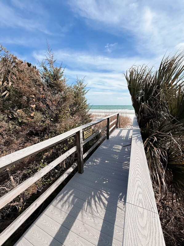 Outside, the large private pool (heat available seasonally for an additional fee) is surrounded by ample lounging space — perfect for soaking up the South Carolina sun while the kids play nearby. If the beach is calling, your private walkway takes you straight to the sand where days are filled with sunshine, salt air, and endless memories.