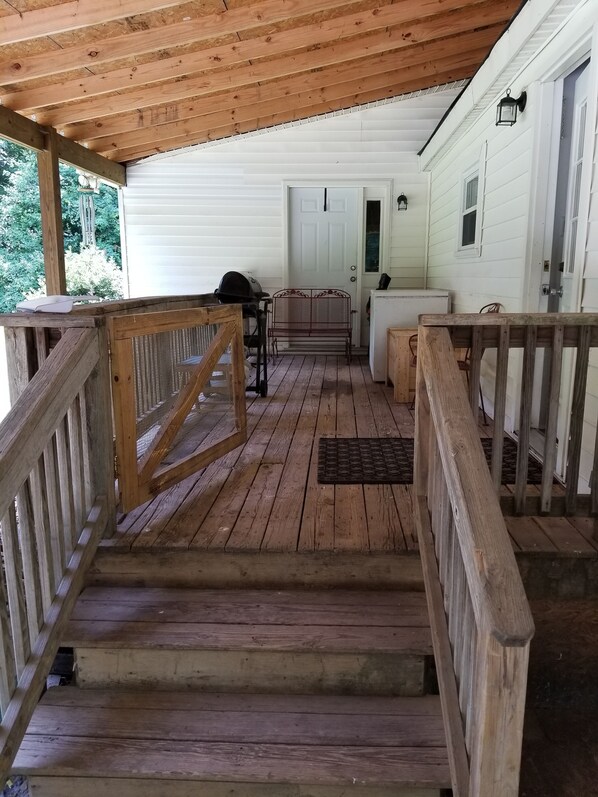 Huset har en overbygd veranda å slappe av på og har en gassgrill på den. Verandaen har en låseklokke på den slik at du kan la hunden din stå ute i et låst område om natten eller mens du er ute og om. Det blir varmt selv om det er dekket. Det er en nærliggende spigot å gi hunden ditt ferskvann. Vi ber om at med mindre hunden din virkelig stikker i nærheten, ikke la dem vandre rundt i nabolaget for hundens sikkerhet og hensyn til våre naboer. Våre nærmeste naboer til høyre ER fryktige for hunder, og vi måtte sørge for at våre var i vår hage hele tiden. Vi har ALDRI hatt lopper. Vennligst ikke ta med hundene med lopper, PLEASE! Vennligst gå dem i bånd hvis de er tilbøyelige til å løpe av. Vi mistet 2 hunder gjennom årene som gjorde det til veien.