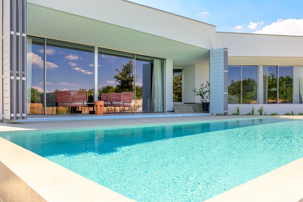 The luxurious Villa BoscAria is located in the small Istrian village of Boškari, offering complete privacy and relaxation, surrounded by nature.The villa features three elegantly designed bedrooms, each with its own en suite bathroom and access to a terrace overlooking the pool. Guests can enjoy a fully equipped designer kitchen with a wine fridge and a spacious living room. Every corner of the villa exudes elegance and comfort, creating the feeling of a true home away from home.The villa also includes a gym, and after a workout, guests can refresh in the heated pool or relax in the sauna. Summer evenings are perfect for outdoor dining in the external kitchen with a large gas grill or simply enjoying the view.Ideal for families or groups seeking luxury, privacy, and comfort, the villa’s location also allows visits to wine roads, local agritourism sites, beaches, and cultural attractions in Istria. Popular destinations are within a short drive: Pula is approximately 25–30 km, Rovinj around 23 km, and Poreč about 35–40 km. The medieval town of Svetvinčenat is nearby, providing easy access to local culture, attractions, restaurants, bars, and shops. Distances: post office 8400m, gas station 11200m, restaurant 5400m, shop 8400m, center 8400m, sea 19200m, beach 19200m, airport 28300m.