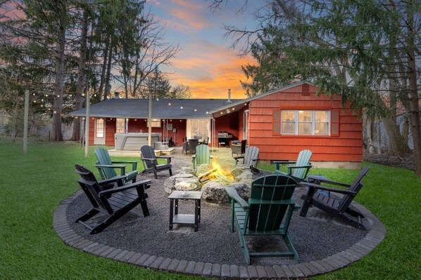 Outside, our carefully designed space offers a paver patio with a dining set for outdoor gatherings. Relax in the six-person hot tub or gather around the fire pit for a cozy evening. Whether indoors or outdoors, this home is crafted for your comfort and enjoyment.