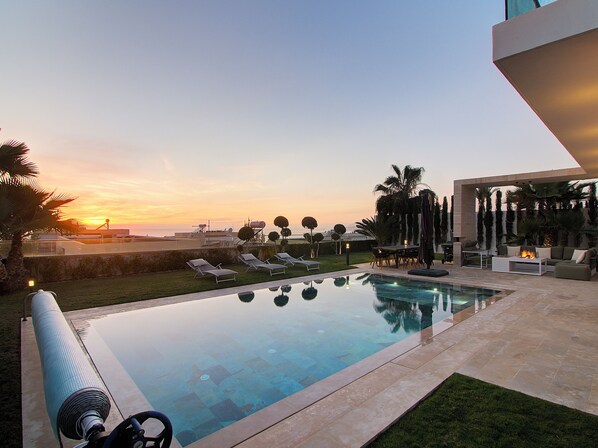 1- large living room that opens up to a heated pool and a fully equipped terrace, complete with a dining area and Smart TV.