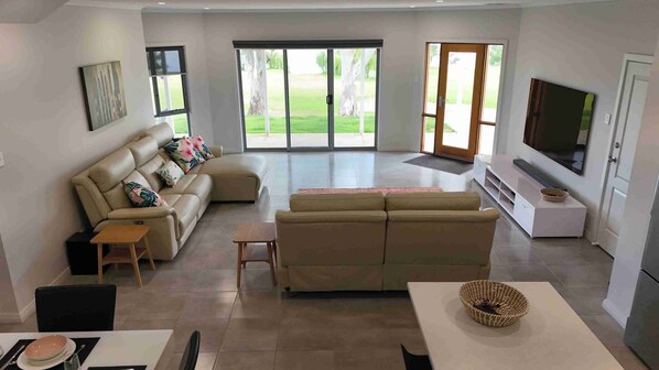 Upstairs on the balcony of Twin Gums there are uninterrupted panoramic river views through the glass balustrade and a comfy outdoor wicker set / sun lounge to enjoy that evening glass of wine while watching the sunset.