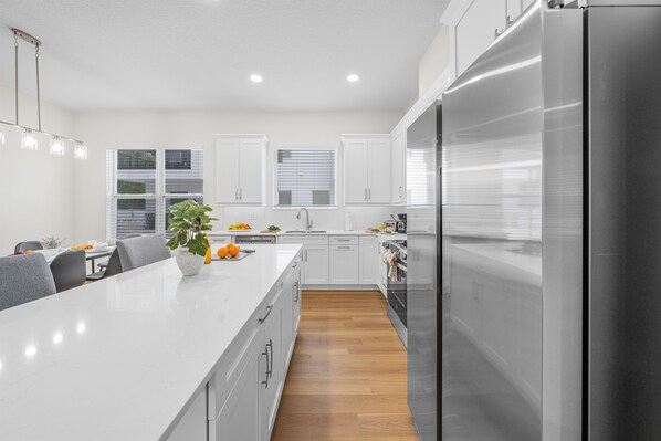 🛋️ Living Room - Featuring cozy seating, a large smart TV, and stylish décor, this space is perfect for relaxing after a day of exploring Tampa. 🍳 Kitchen - The fully equipped kitchen is a chef’s dream, featuring sleek white shaker cabinets, quartz countertops, and stainless steel appliances. 🍽️ Dining Area - The dining area sits seamlessly between the living room and kitchen, offering a perfect space for shared meals and gatherings.
