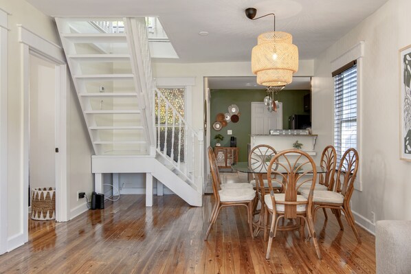You can comfortably seat 6 around the dinner table in our boho dining area.