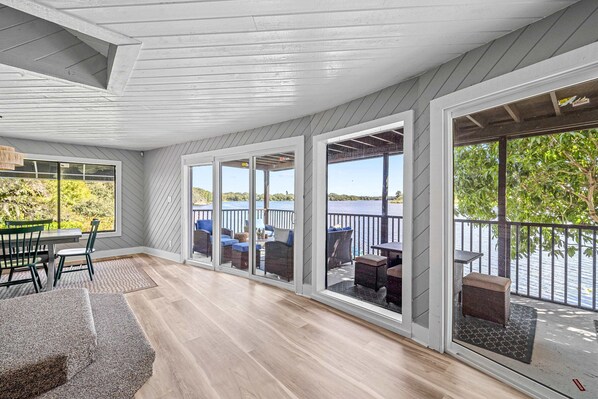 Sprawling river view estate with game room dock kayaks grill and fishing gear