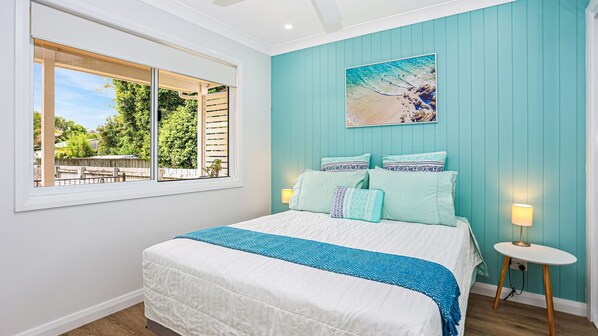 Stepping inside, the cottage boasts a tastefully designed space with two tranquil bedrooms. The room configuration comprises of a tranquil master bedroom and an equally delightful secondary bedroom, all featuring comfortable bedding, refreshing air conditioning, and calming ceiling fans for warmer nights.
