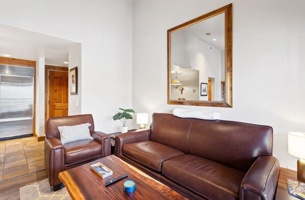 Ski IN, Ski OUT, Soak, Sip and repeat! The Mountain Lodge offers stunning views at every turn and enough amenities, services and charm to have you well taken care of when you're off the mountain! This deluxe studio features warm design, a personal patio, a cozy fireplace, a flat screen TV, deluxe kitchenette (just no oven) with new appliances, new wood floors, ample storage space and a full rotation of resort-style services! There is a King bed separated from the living room by a stone fireplace. The living area has a queen sleeper sofa if needed. The Mountain Lodge Retreat is outfitted with premium coffee, teas, snacks and sparkling waters.