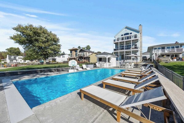 Lakefront living takes center stage: the private boat slip welcomes your vessel, the fire-pit seating for six to eight lets you gather under the stars, and furniture can be moved from the pool deck into the fire-pit area for flexibility. The heated salt-water pool (open May 1 – Oct 31 starting 2026; closed remainder of 2025) invites splash-filled afternoons. There’s a pool house zone with food/ice-maker/bar seating, sun loungers, and plenty of outdoor gear and kids’ pool-games. Additional outdoor amenities: a barbecue grill, outdoor dining table, small grassy yard with cornhole, two balconies and a deck—ideal for morning coffee or evening cocktails.