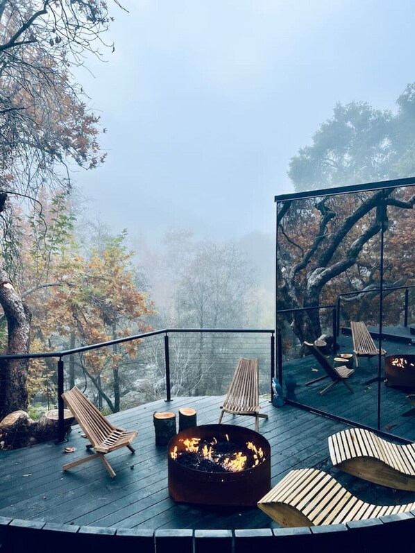 Shared firepit and sauna .