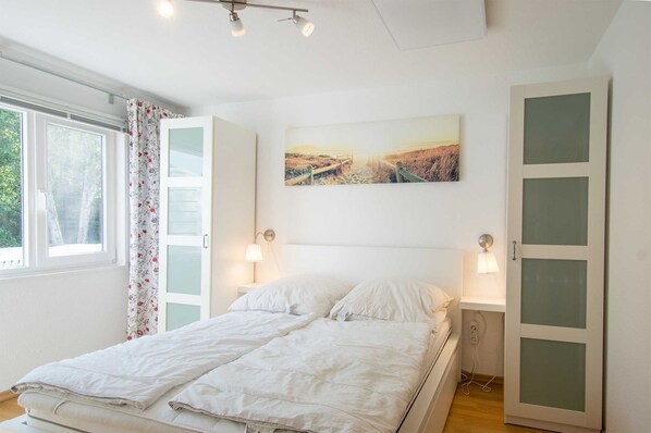 Die Schlafräume sind aussreichend, im rechten steht ein Doppelbett und zwei Sofass. Statt eines Sofas wäre hier ein kleiner Tisch praktisch an dem die Kinder sich hinsetzen und spielen können, im Wohnbereich war dies nicht möglich. Im Garten ist viel Platz, die Wiese wurde auf Anfrage gemäht.