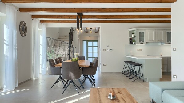 On the ground floor there is an open-plan living area with a kitchen, dining room and lounge, as well as one of the bedrooms with a bathroom. The interior will appeal to lovers of modern elegance with a touch of tradition. French doors flood the entire space with natural light, and light colours add to the airiness. The kitchen is fully equipped with modern appliances and has a counter with high stools, great for preparing meals together. The wooden dining table seats 8 and a high chair for children is also available. The spacious living room is decorated in a modern, minimalist style that creates a relaxing atmosphere. There is a comfortable corner sofa and a smart TV that will come in handy for an entertaining movie night or a quick break from the activities outside. From the living room you have direct access to the covered summer kitchen.