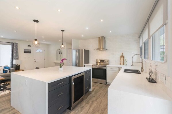 The fully-outfitted kitchen includes an electric stove, full-size fridge, drip coffee machine, kettle, toaster, blender and all necessities to prepare a gourmet meal, including pots and pans, spatulas, spices and oil. Long counters and a large waterfall island provide ample space for food preparation, cooking and baking.