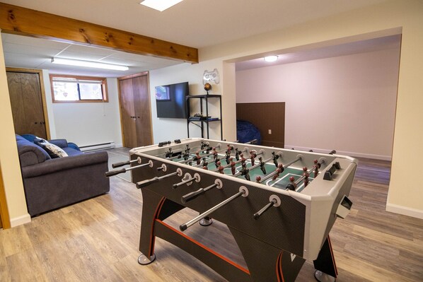 Game room: Pool table, ping pong table top, air hockey game table, foosball table, PS4 console, TV and a pull-out couch.