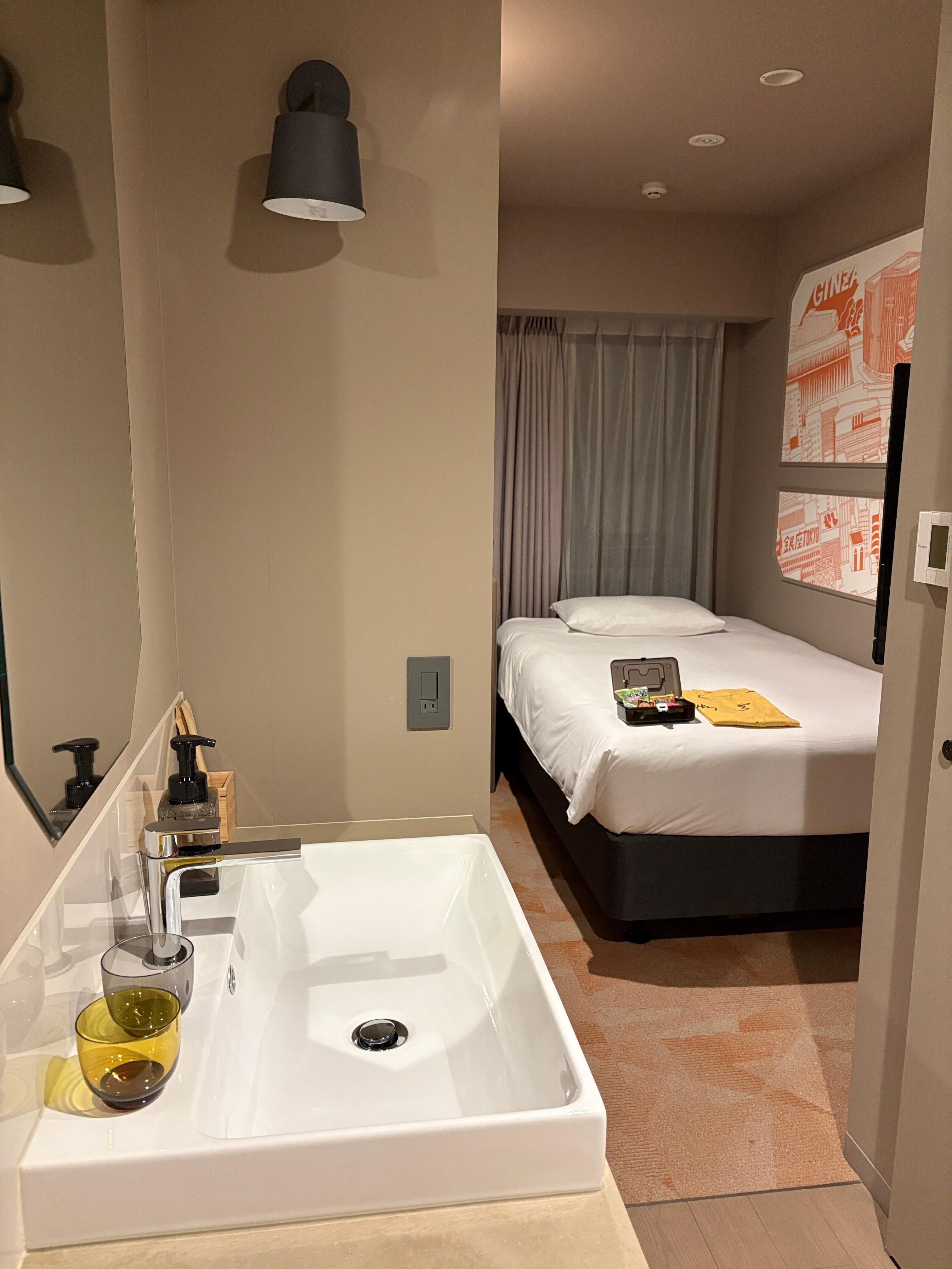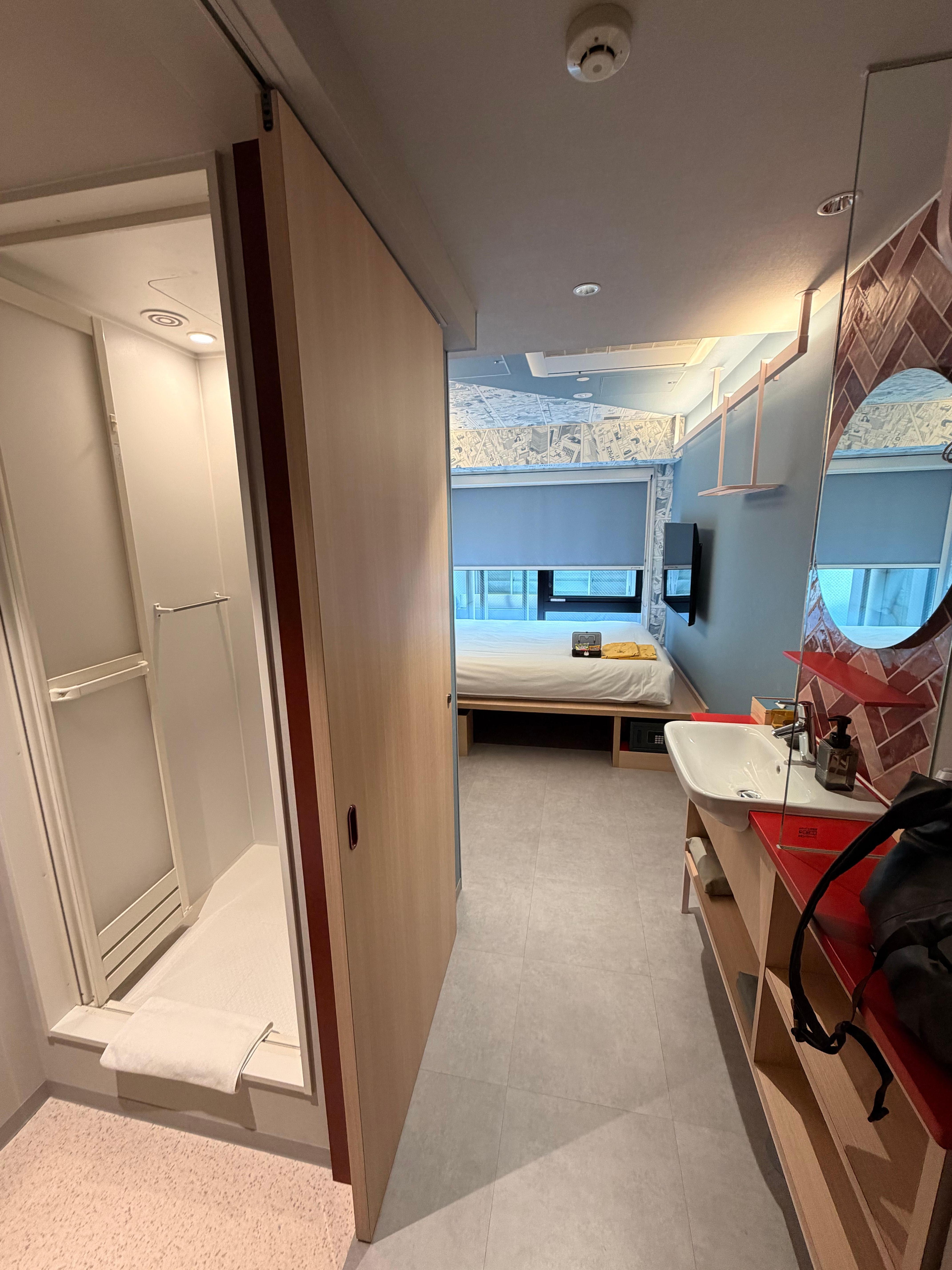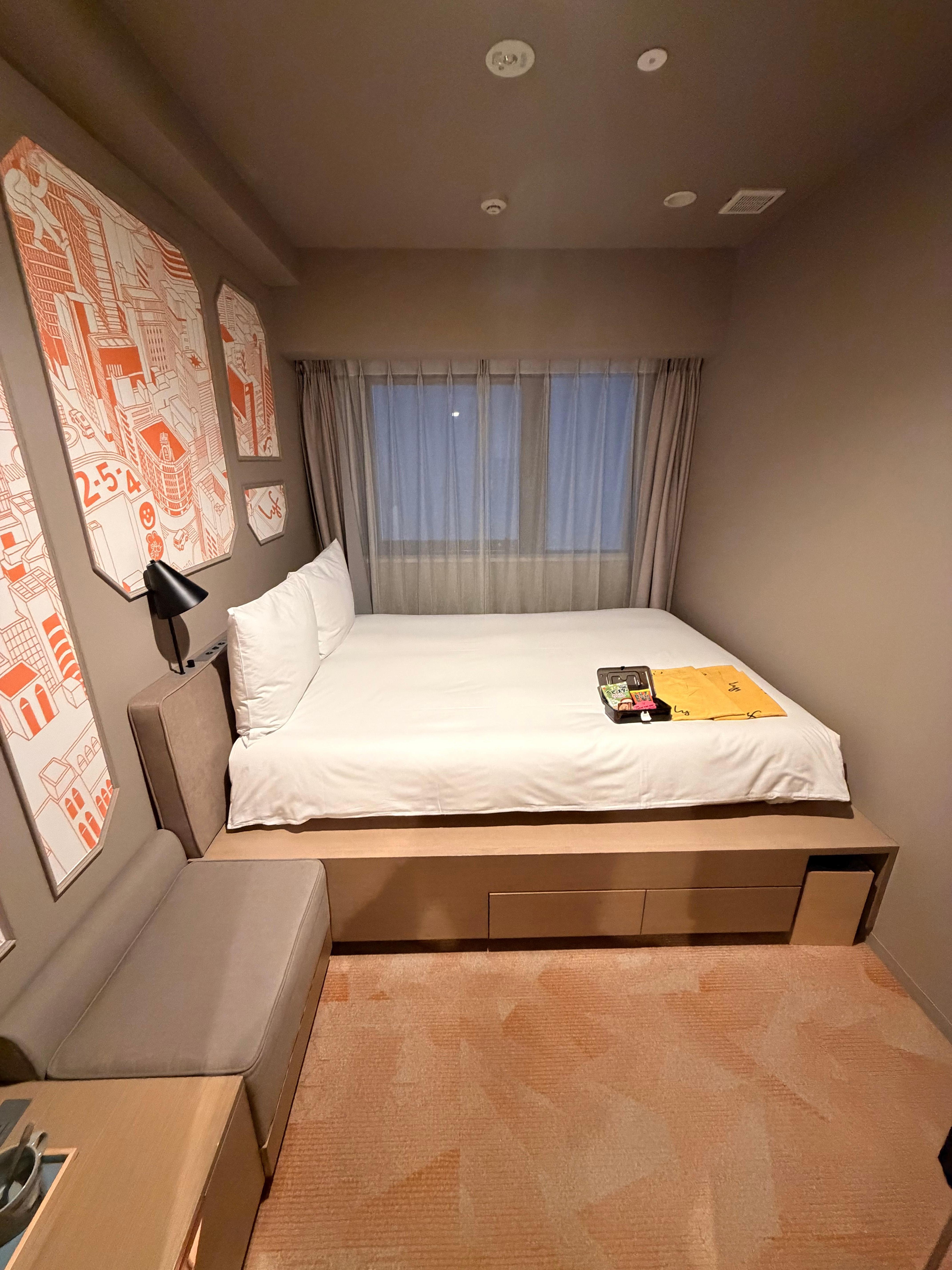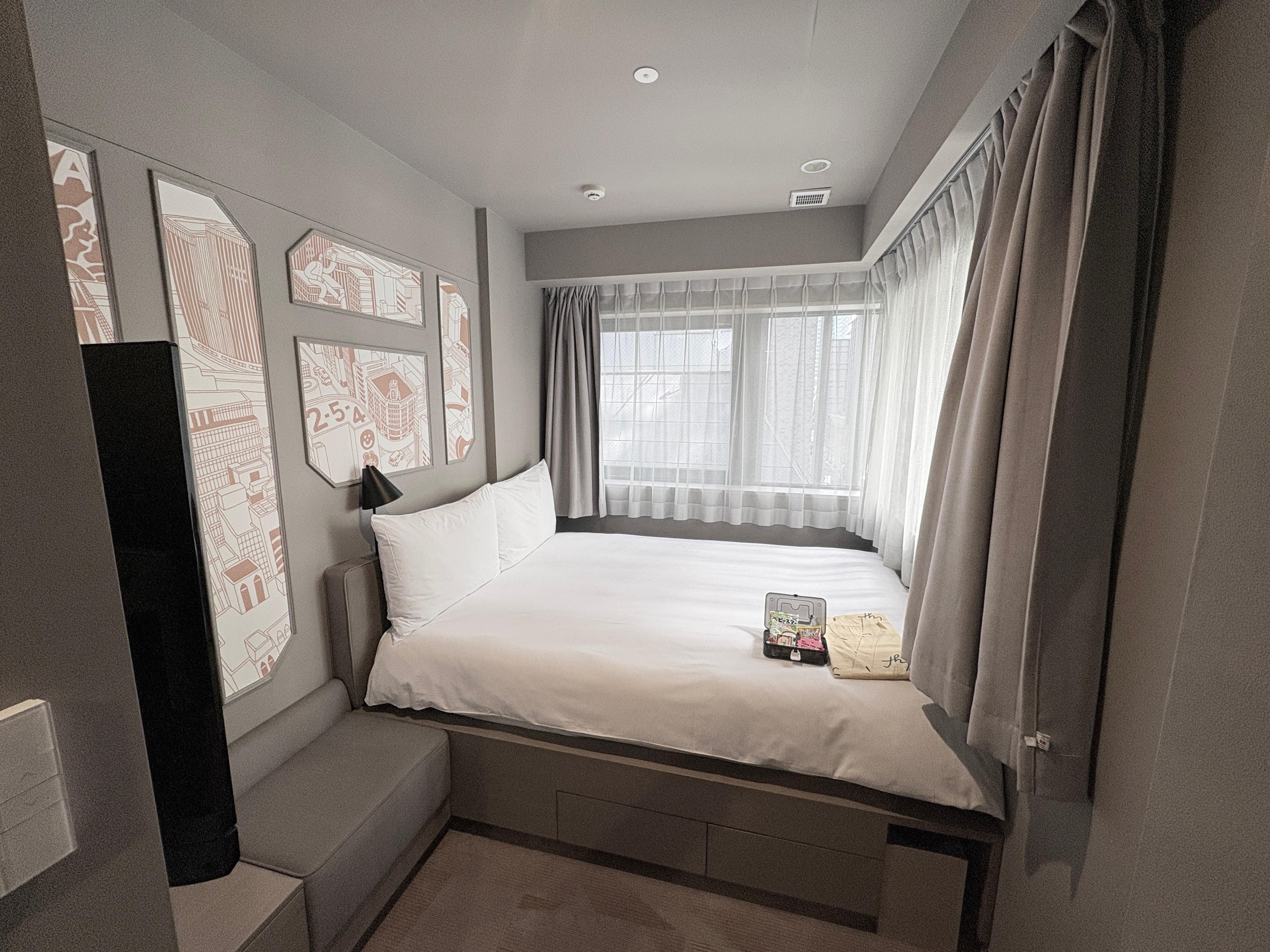 Excellent ramen shop right outside the entry, multiple convenience stores and metro stations. Comfy beds and pillows, they really maximized the available space in the rooms and overall the hotel has a fun design.