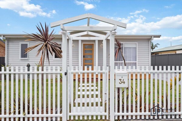Step through the white picket fence and wander along the charming garden path to find this stunning beachside retreat. The open-plan kitchen, living, and dining area provides a welcoming space for relaxation and entertainment. The master bedroom features a king-sized bed, an en suite with a walk-in wardrobe, and a luxurious bathtub for indulgent soaks. Two additional bedrooms offer queen-sized beds and ample storage. The second bathroom impresses with a large walk-in shower, terrazzo tiles, and gold fittings under a bright skylight. Outside, the expansive backyard is ideal for kids and pets, while the barbecue area with a kitchen bench and lounge seating is perfect for outdoor dining. This elegant home offers a peaceful and comfortable beachside escape.