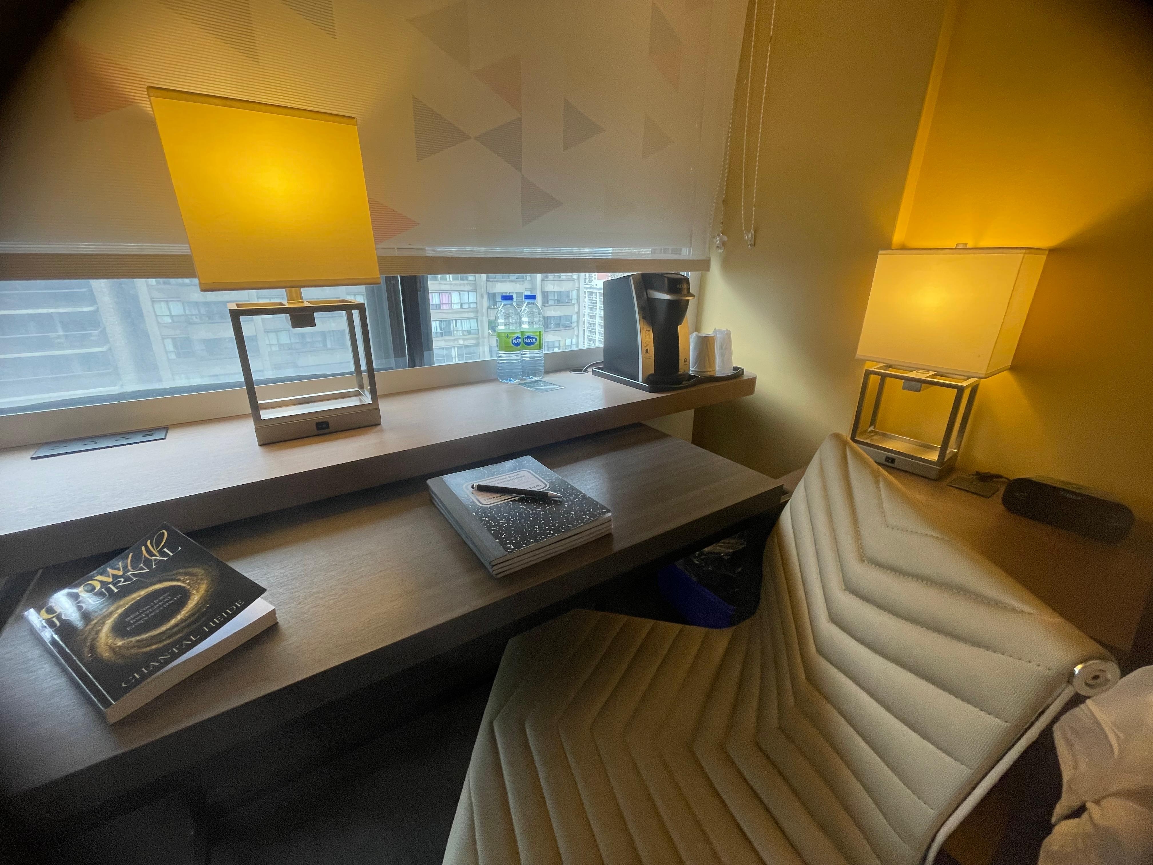 However, if prices go back to normal afterwards, this hotel is great, walkable to theatre & lots of restaurants, rooms are small ( especially bathroom), but all is very clean, beds & pillows are awesome, shower is great, has soap, shampoo & conditioner dispensers, also beside sink there are soap & body lotion dispensers, rare in most hotels. There is a fridge, big closet, and amenities desk with 2 bottles of water & coffee. We would come back.
