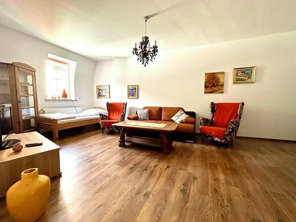 Welcome to our holiday apartment Am Wanderpfad in historic Traben-Trarbach on the Moselle. Located in our lovingly restored winemaker's house in the old town, our apartment on the second floor offers everything you need for a relaxing stay. The living-bedroom exudes coziness. A sofa bed, a coffee table and two armchairs invite you to relax, while the flat-screen TV with satellite reception provides entertainment. The adjacent kitchenette is fully equipped, including an electric stove, oven, microwave, refrigerator, coffee machine, kettle and toaster. The dining area with a large table and four chairs is perfect for shared meals. The separate bedroom has a comfortable double bed, an armchair and a spacious closet. The bathroom has a shower, toilet, sink and all the necessary amenities such as a hairdryer, towels and shower towels.
