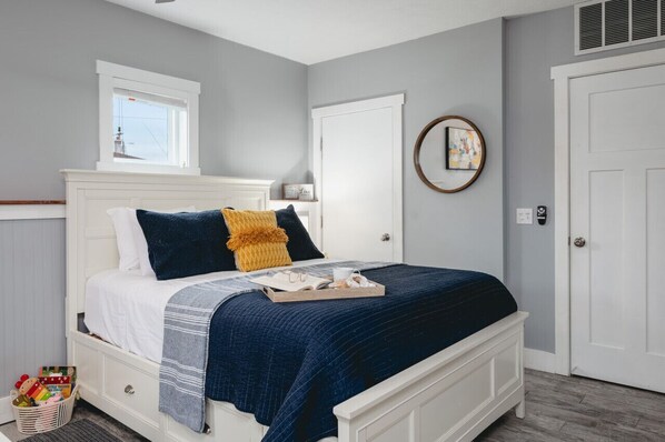 The bright, open-concept sleeping area features a queen-size bed and a full futon, comfortably accommodating up to three guests. Families traveling with little ones will find a Pack ‘n Play, toys, and children’s games available for use. Pet amenities are also provided for your furry friend’s comfort.