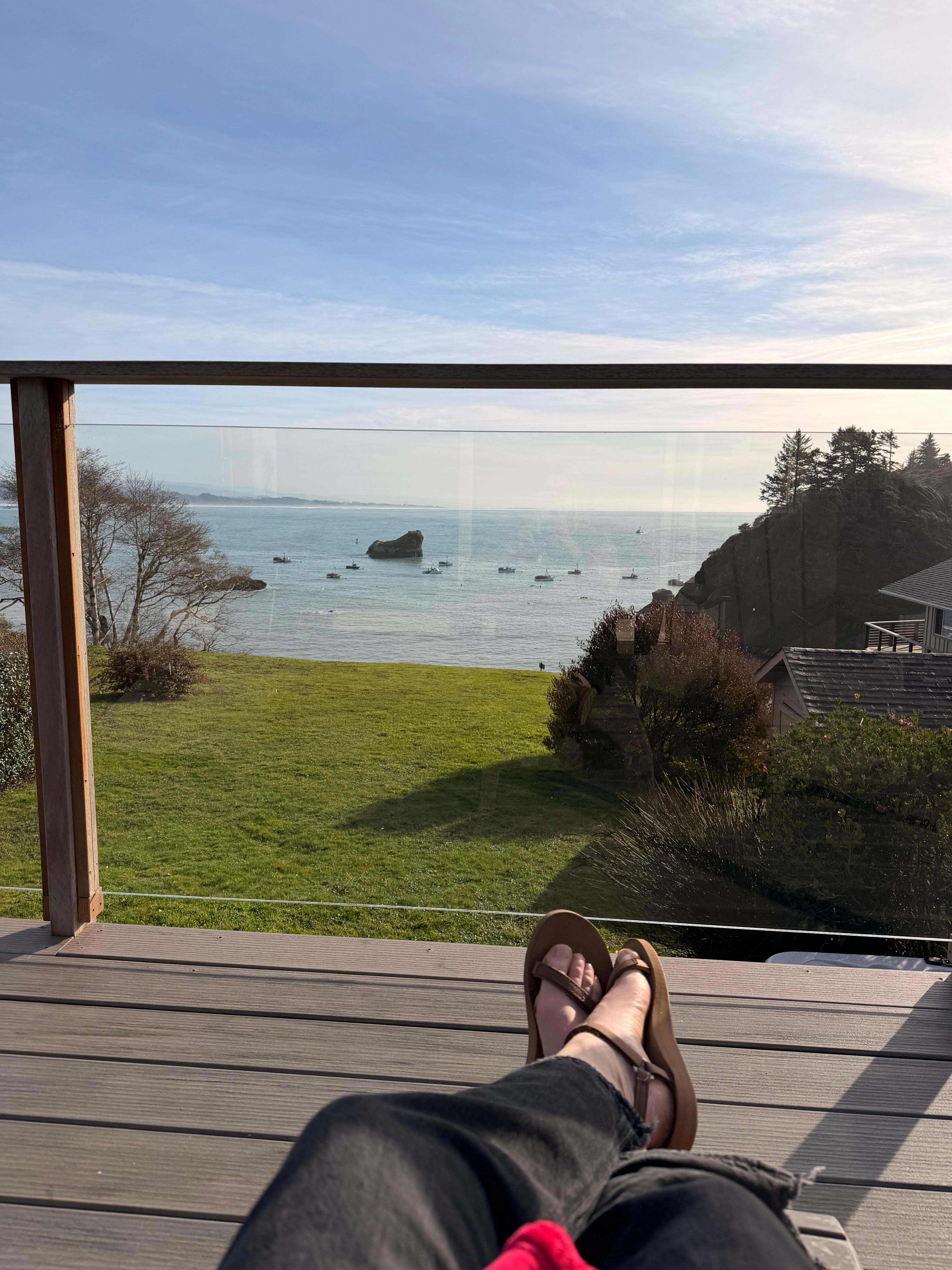 De tre soverom pluss to marmor komplette bad er plassert nede. Sov til lyden av havet i Master bedroom komplett med skyvekontrollen for å gå ut og nyte bukten, overbygd uteplass og boblebad. Hovedsoverommet har rikelig med privatliv w / a King bed, T. V. og eget bad m / dusj. Det andre soverommet har også en King bed, havutsikt og direkte patio tilgang til badestamp. Dette rommet har også en stor flatskjerm T. V. Det tredje soverommet har en Queen seng. Alle rommene er svært komfortable og velutstyrte. Den andre og tredje soverommet dele en annen vakkert marmor flislagt bad med badekar og dusj. Ovenpå er stue, spisestue, kjøkken og et beleilig plassert halv bad. Den har en meget godt utstyrt kjøkken og splitter nye frokost bar med alt en kokk ville trenge. Møblene er moderne, elegant og komfortabel. Den vedfyrte peis bare legger til stemningen (gratis tre følger med). Du kan også nyte den oppe brede dekk og grill på propan grillen mens du nyter utsikten over Trinidad Harbor. Vi har gitt gratis trådløst internett, utvidet kabel T. V og en super morsom ferdig garasje komplett med et pingpongbord, barnespill og bønneposestoler. Vaskemaskin og tørketrommel ligger også i garasjen. Dette hjemmet ligger innen lett gangavstand fra lokale strender, brygge, fyr, turstier, restauranter og Murphy's Market. Vær oppmerksom på at det ikke er inngjerdet hage, men rikelig med gress for barna å leke!