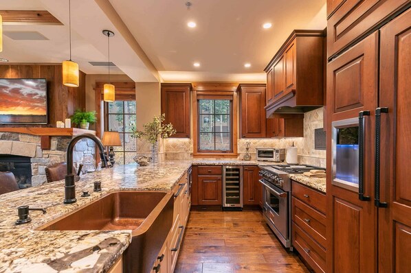 This Platinum, slopeside, corner residence offers a family room with a natural stone gas fireplace and hardwood flooring, a true chef’s kitchen with Viking appliances and wine refrigerator, plus a dining area for six+ finished with wood cladding. Additional features include dual guest suites, each with a king size bed and attached bathroom, and a third bedroom with a king bed, reclining sofa in living area, custom lighting, a spacious entryway with benches and storage cubbies, washer/dryer and underground parking for one vehicle.