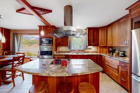 A highlight of the interior living space is the kitchen, beautifully outfitted with custom-built cherry wood cabinetry, stainless steel appliances, and an eat-in dining space. After dinner each evening, stream your favorite movies in the living room, toss the day's clothes in the washer/dryer, and make plans for tomorrow using the complimentary WiFi. There's even a home office space with a desk in case you're planning to work remotely during your stay.