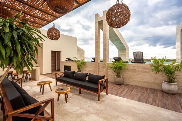 • Elegant Rooftop pool with jungle views and lounge chairs