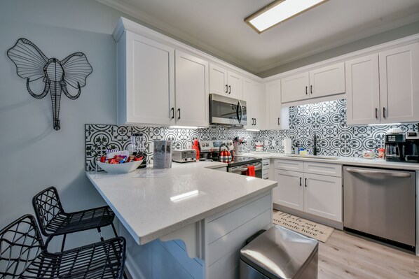 There is a full kitchen with both a Keurig and 12 cup drip coffee maker. You will have everything you need to make a meal or whip up some tailgate snacks! There is an electric fireplace in the living room and plenty of board games. Grab the corn hole game in the condo and have some game day fun!