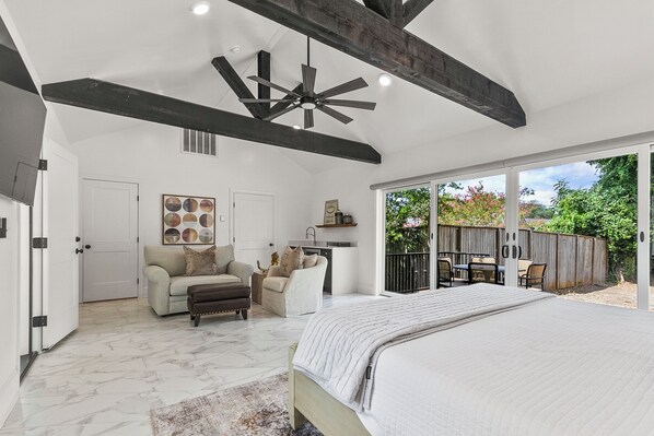 The private master suite boasts an open floor plan with a seating area, kitchenette, wine fridge walk-in closet, en suite bathroom and private deck. The 1st bedroom on this floor boasts a king bed and direct access to a full bathroom. Sofa folds out in to twin sleeper.