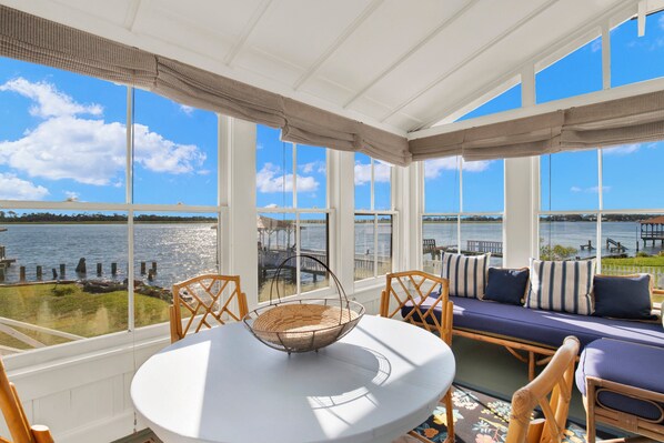 Inside, two complete levels accommodate two separate families with three bedrooms, two baths, a fully stocked kitchen and communal spaces on each floor. On the main floor, a generous screened porch with river views offers plenty of seating, including a bistro table, cushioned benches, picnic tables and a wicker conversation grouping.
