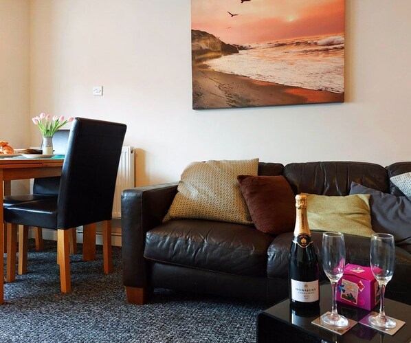 Tastefully decorated, the lounge/diner is bright and spacious with laminate wood flooring and a wall hung feature fire. It has quality leather chairs and a sofa, and an extendable dining table which seats 6.