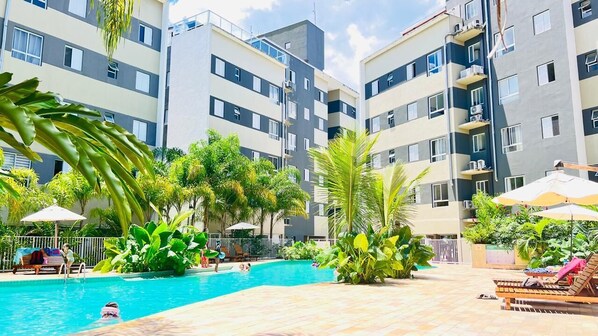 Leilighet med familievennlig profil og med utendørsbasseng og innendørsbasseng