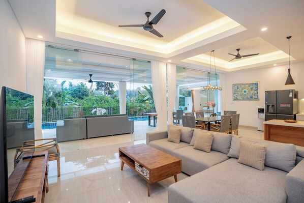 Gjesterom med airconditioning på denne villaen har flaskevann (inkludert) og tøfler. 34-tommers LCD-TV inkluderer digital-TV og Netflix.