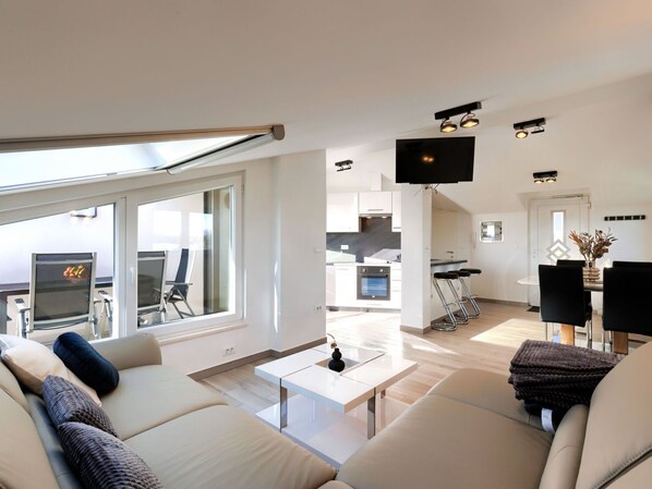 The 3-room apartment is 70 m2 and located on the top floor. It features a living/dining room with sloping ceilings, ceiling height ranging from 120 to 260 cm, and a rooflight with satellite TV and air conditioning. The living/dining room provides access to the terrace. One room has sloping ceilings with a ceiling height between 120 and 260 cm, a rooflight, a double bed (2 x 90 cm, length 200 cm), satellite TV, and air conditioning. Another room also has sloping ceilings with a ceiling height between 120 and 260 cm, a rooflight, a double bed (2 x 90 cm, length 200 cm), a shower/WC, satellite TV, and air conditioning.