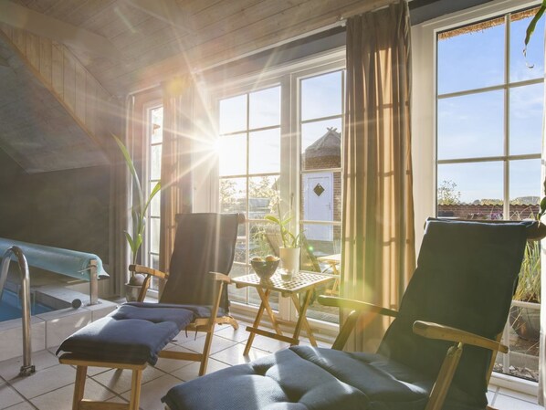 Enmannsbolig, bygget i 1995. 1.2 km fra sjøen. Privat: uberørt tomt 2'639 m2, innendørs pool (3 x 5 m, 18 m2, dybde 135- 135 cm dyp). Grill. I huset: badstu, vaskemaskin, tørketrommel. Parkering ved huset. Daglivarehandel 1.3 km. Eieren godtar ikke noen ungdomsgrupper.
