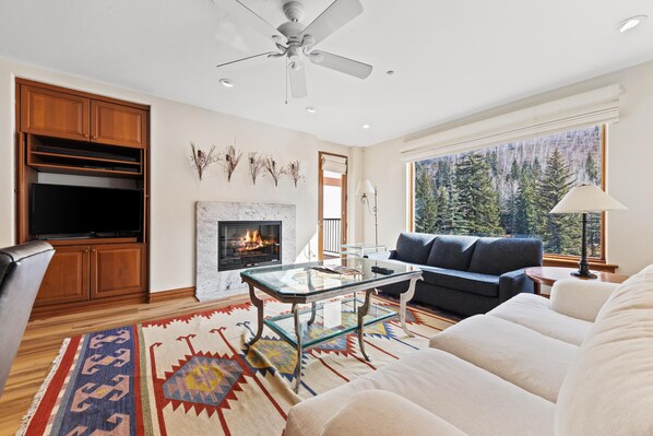 Upscale decor and warm wall colors make this a truly inviting condo. Mountain and creek views add to the beauty that is already in the unit. Living room is beautifully decorated and leads out to a deck with a gas grill.