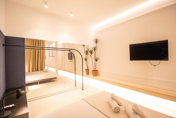 The main bedrooms have a queen size bed, smart TV, ceiling fan, and abundant space to store clothing and suitcases.