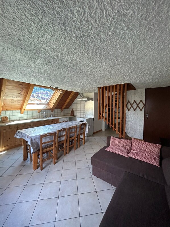 The Les Ecrins apartment is located on the 3rd floor of Chalet Moulinot and comprises a living room with sofa, TV, dining table and open-plan kitchen equipped with dishwasher, oven, microwave, coffee maker, kettle, etc.