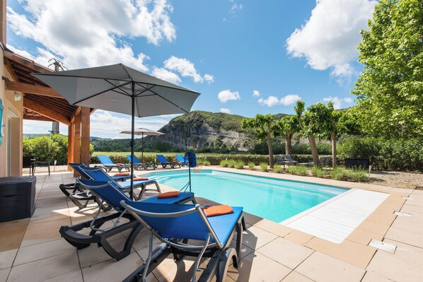 Utenfor: vakker utsikt over omkringliggende vingårder og åser, er denne villaen i utkanten av parken. Moden hage med privat basseng omgitt av solsenger for å nyte solen. Ønsker å pensjonere seg her i skyggen på den overbygde terrassen er også mulig.