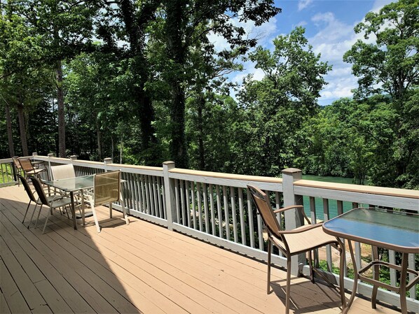 Nydelig 2-etasjers tømmerhytte med 150 fot strandlinje på The Current River. Når du går inn blir du møtt med vindusvegg fra gulv til tak i det hvelvede store rommet, et fullt møblert kjøkken, en frokostkrok og et halvt bad. En åpen planløsning gir deg fantastisk utsikt over elven og franske dører som går ut til et stort dekk som er perfekt for å nyte de naturlige omgivelsene. Hovedsoverommet i hovedetasjen er innredet med en king size-seng og 42 "TV med eget bad med en dobbel forfengelighet, dusjkabinett og boblebad. Et åpent loft med utsikt over hovedetasjen har tre enkeltsenger og en enkel trille seng. Det lavere nivået presenterer et koselig familierom med walkout-franske dører som åpner seg til et bortgjemt underdekke og to ekstra soverom som hver har en queen size-seng. TV er tilgjengelig på hvert av soverommene og familierom. I underetasjen finner du også et komplett bad samt en vaskerom med vaskemaskin og tørketrommel. Første og andre etasje dekk med utsikt over elven gir god plass for avslapning og uteservering. Gratis trådløst internett og satellitt-TV tilbys for underholdning under den nedetiden du måtte ha på besøket. Hvis du reiser med spedbarn / småbarn, er en barnestol, bassinett & pakke og lek alle tilgjengelige for bruk.