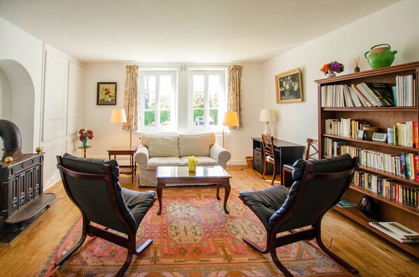 The apartment occupies part of the ground floor of this beautiful house, inhabited as a second home by a discreet owner. It has a private garden, sheltered from view, and opposite the owner's garden, on the other side of the house. The dwelling, very bright, is open with numerous windows. A beautiful entrance leading to the garden, distributes a vast and comfortable living room, a small bedroom with 2 single beds that can be joined (80 x 200 cm) for one adult or two children, a well-equipped kitchen (oven, vitroceramic hob, fridge/freezer, dishwasher, microwave...) serving as a dining room. Then through a corridor, one accesses the large bedroom (double bed 160 x 190 cm) and the bathroom (bath/shower, washbasin and WC (washer-dryer).