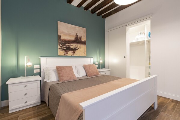 Modern apartment on the first floor of an ancient Venetian palace. The apartment has a large, shared terrace from which you can admire the canal and the city. The living area includes a welcoming living room with a sofa and a dining table. The kitchen, complete with everything you need for cooking, includes a microwave, dishwasher, kettle, and toaster. Suite 1241 has two finely furnished bedrooms, the first with a queen-size bed, the second with a single bed and a queen-size bed. The layout is completed by a bathroom with a shower.
